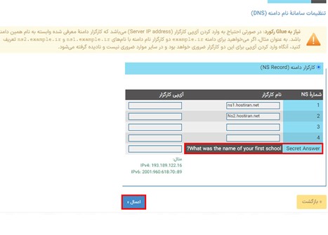حالا در صفحه کارگزار نام و میزبانی دامنه، از بخش “تنظیمات سامانه نام دامنه (DNS)” در قسمت “کارگزار دامنه (NS Record)”، مطابق تصویر، در ستون “نام کارگزار”، ردیفهای ۱ و ۲ را با DNSهای موردنظر تکمیل کنید. سپس لازم است در بخش “پاسخ سوال امنیتی”، پاسخ سوال امنیتی که در هنگام ثبتنام وارد کردهاید را مجدداً وارد کنید.